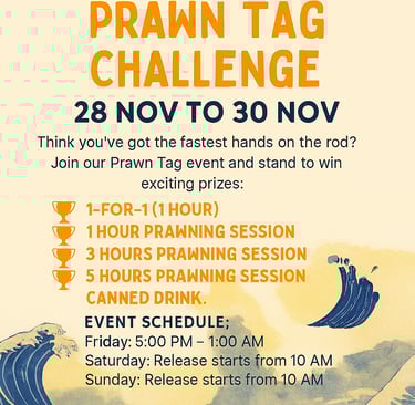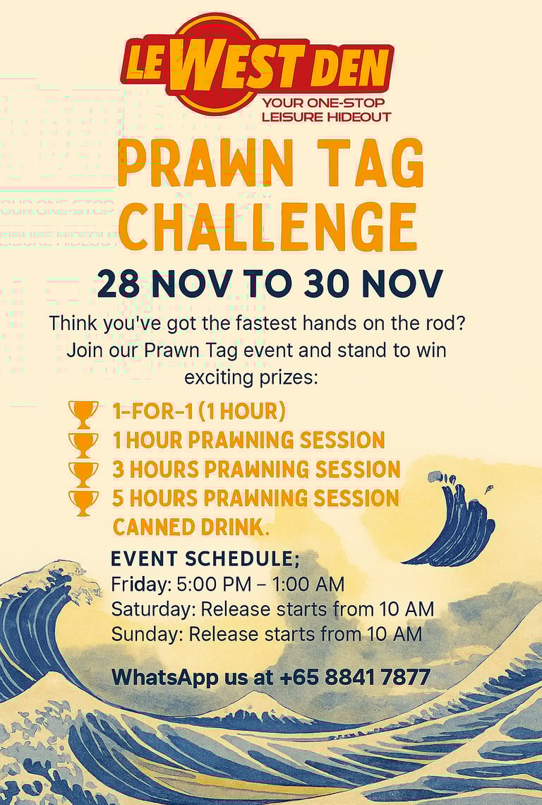 PRAWN TAG CHALLENGE @ Le West Den Prawning ✨🦐 Think you’ve got the fastest hands on the rod? Join our Prawn Tag and stand to win exciting prizes
